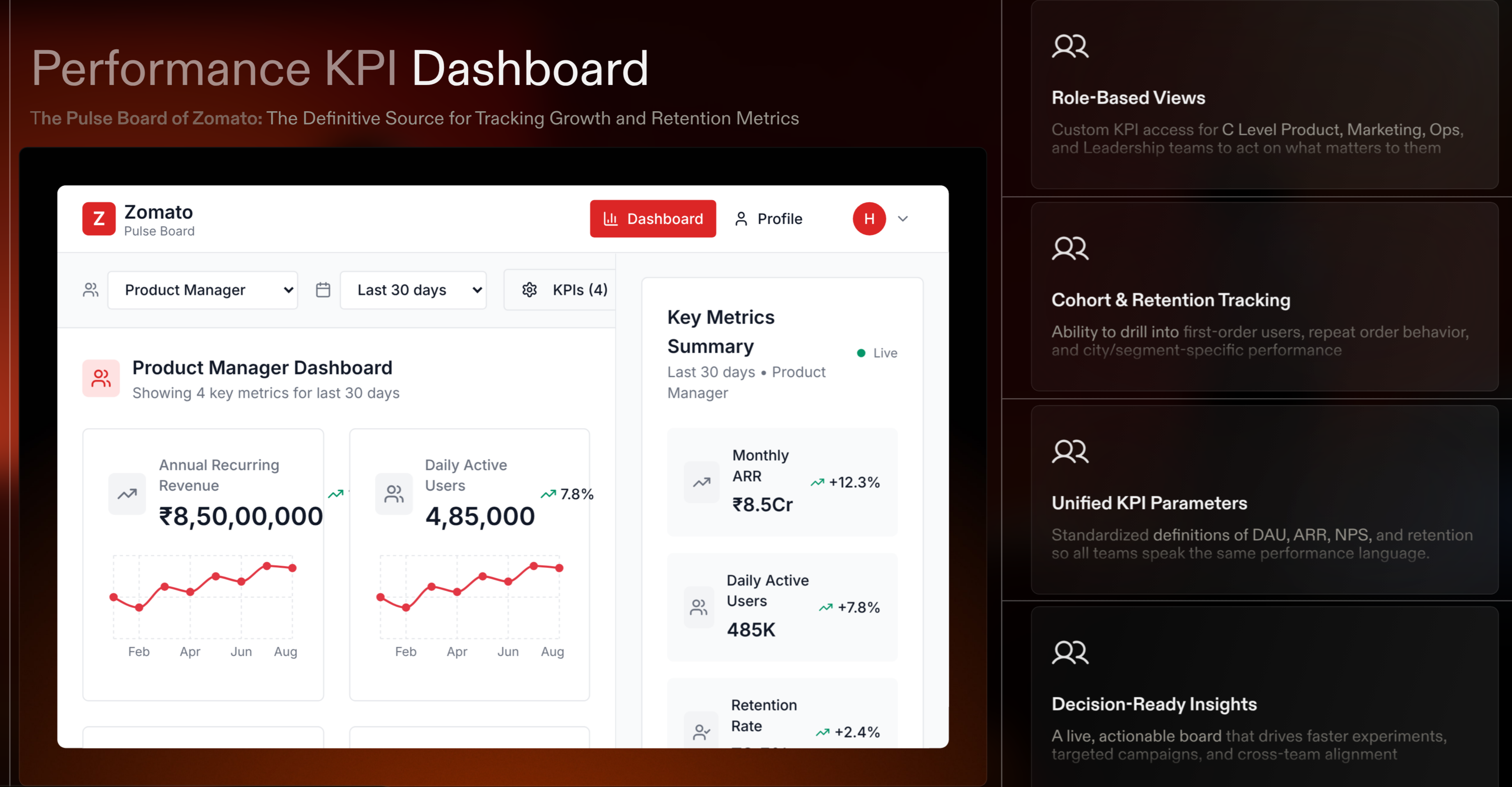 The Pulse Dashboard unifies KPIs into a live view of DAU/WAU, CAC vs retention, user funnel, cohorts, GMV, and sentiment. Role-based access ensures product, growth, and ops teams track insights relevant to them, driving loyalty and sustainable growth